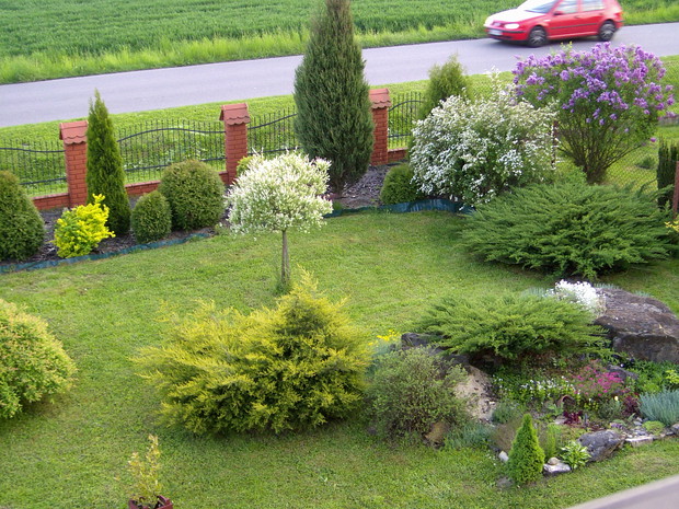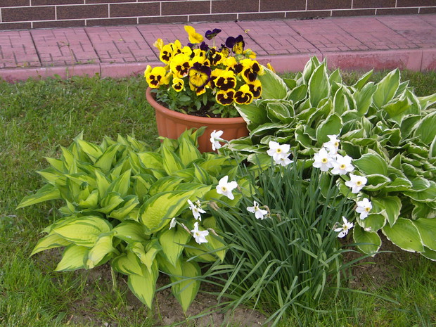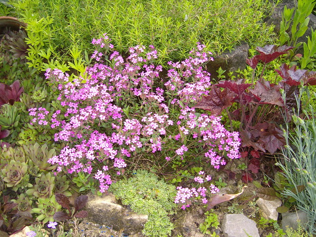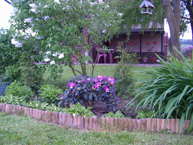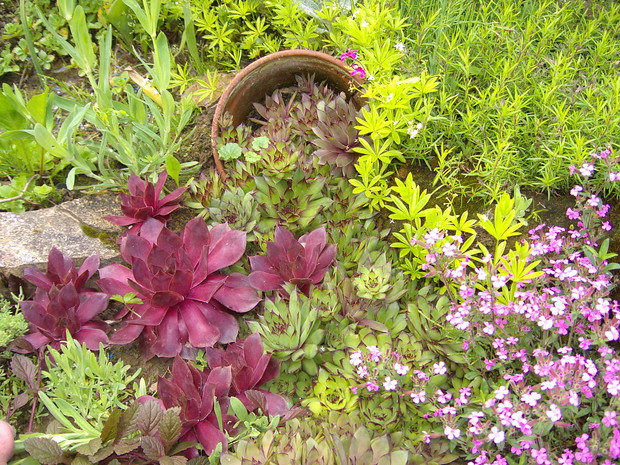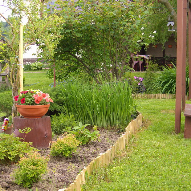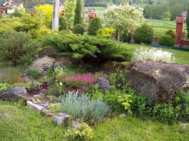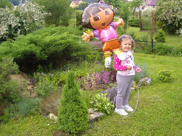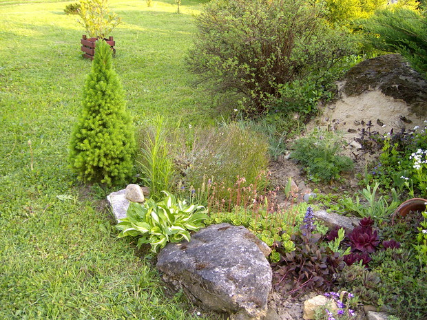 Maj to chyba najbardziej kolorowy miesiąc w ogrodzie .Zieleń jest taka soczysta a kwiaty wręcz kipią kolorami .Spacerując pośród rabat można podziwiac niezapominajki , funkie ,bratki posadzone w donicy ,petunie , które stoją na starym klocku do którego kiedyś był przykręcony blat i służył za stolik .Wiosnę też widac na skalniaku zrobiło się kolorowo .itd ................