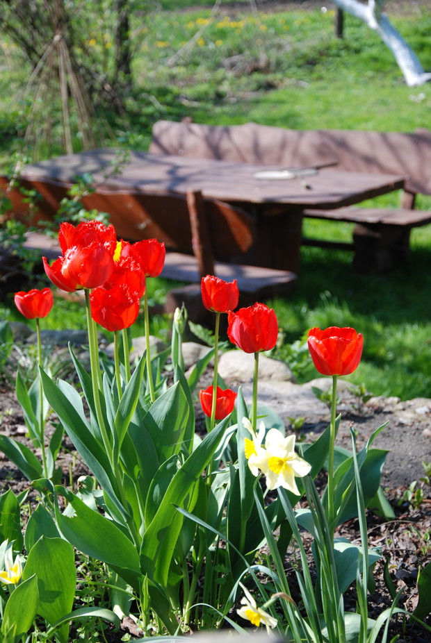 kolejne zdjęcia z mojego zaczarowanego świata, tulipany ,które jako jedne z pierwszych kwiatów budzą ogród do życia i także mnie,są też zdjęcia ogródka który znajduje się blisko jeziora, otoczony kamiennym murem, trochę w stylu angielskim, kiedy już przekwitną tulipany ich miejsce zajmują konwalie, funkie,obok znajdują się kamienne schody na których przyjemnie jest posiedzieć letnią wieczorową porą, patrząc na kolorowy zachód słońca nad jeziorem.