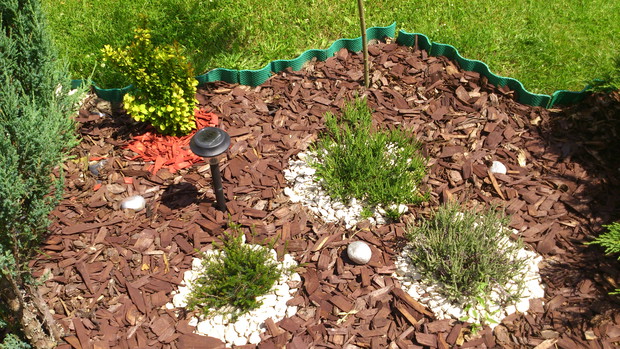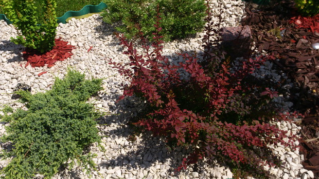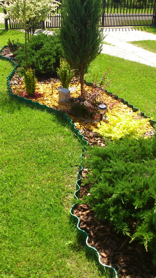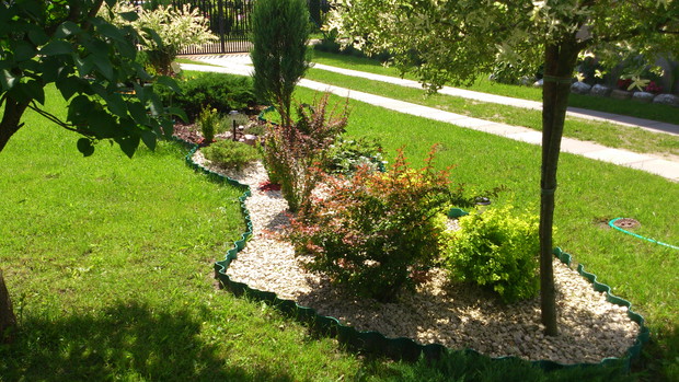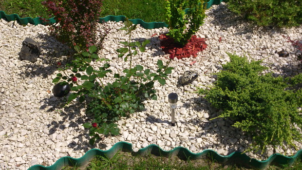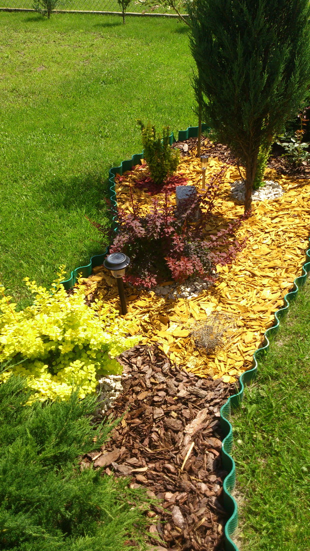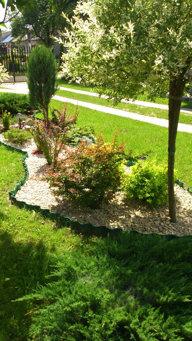 pomysł na stworzenie czegoś nowego w naszym ogrodzie pojawił się niedawno,więc postanowiliśmy zagospodarować nie wielką część wzdłuż chodnika.I tak powstała ''rabata'' z wierzbami ,berberysami o różnych kolorach i odmianach,tujami i jałowcami.Gdzie nie gdzie pojawiły się krzewy róż czerwonych i wrzosy tak aby przez cały sezon cieszyły oko kolorami.