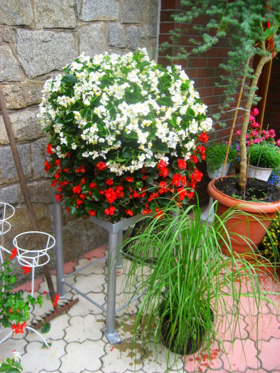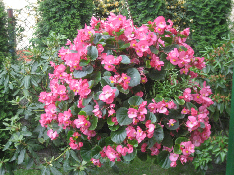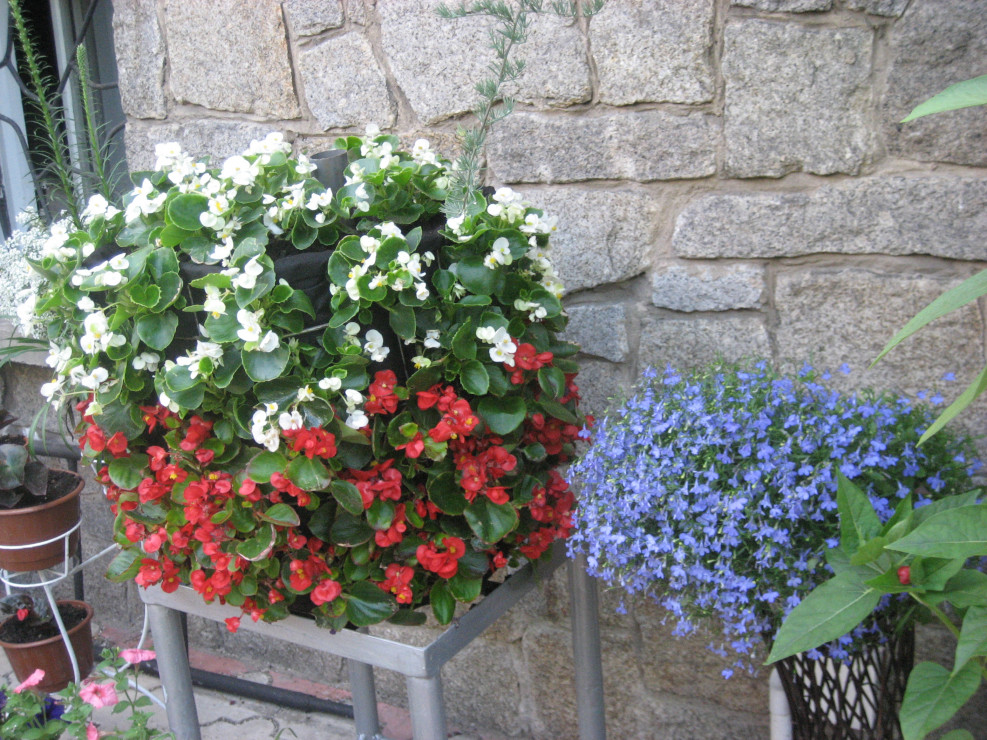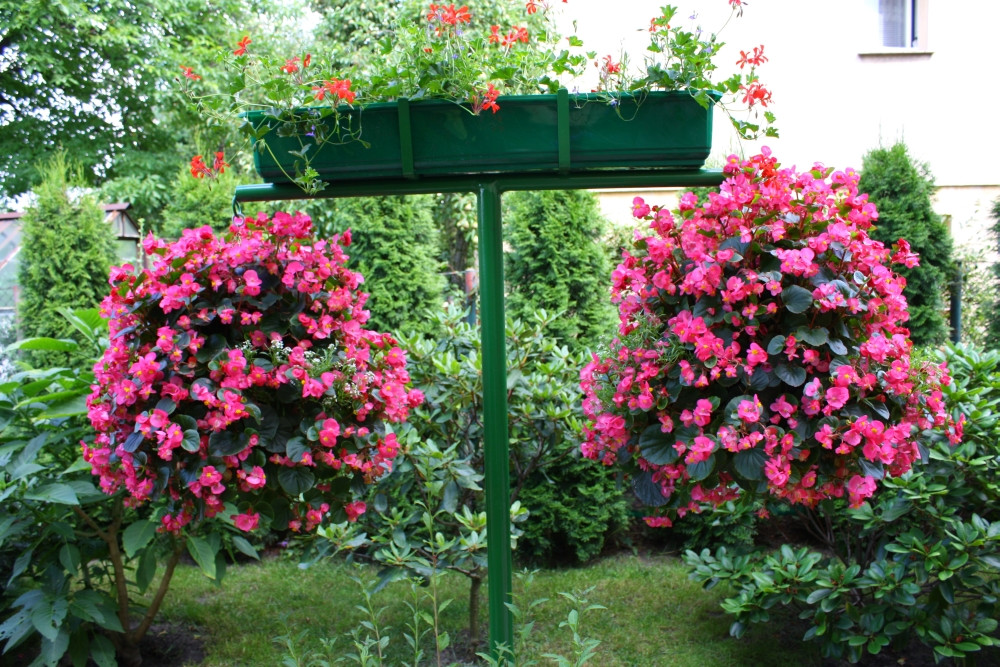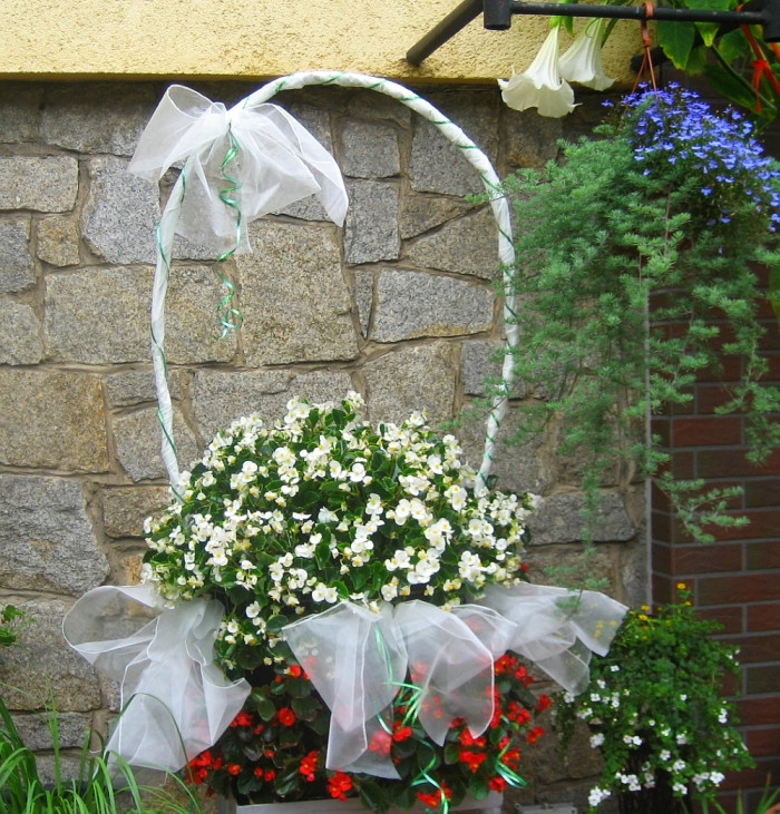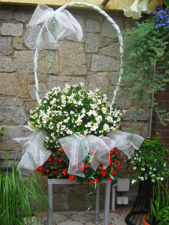 W moim ogrodzie wykorzystałam kosze rożnej wielkości i o różnych kształtach. Teraz opiszę jak obsadzać kosze, tak aby stanowiły ładny element dekoracyjny przez całe lato, aż do późnej jesieni. Można to robić na dwa sposoby: Pierwszy to obsadzanie kosza kwiatami od zewnątrz, a drugi od wewnątrz. Ja preferuje ten drugi. Kosz stawiamy na doniczce lub wiaderku wyścielamy go agrowłókniną. Na dno kładziemy kawałek foli wyciętej w postaci kółka (celem zatrzymywania wody). Następnie na folie sypiemy trochę ziemi i robimy w koło foli 4 naprzeciwległe nacięcia w materiale. Przez wykonane nacięcia przeciągamy sadzonki uprzednio owijając folią (aby się nie połamały). Przysypujemy znowu ziemią zmieszaną z wolno-działającym nawozem w granulkach. Następne nasadzenia będą 15 cm wyżej, ale po ukosie, aby kwiaty się nie stykały swobodnie wypełniając puste miejsca tworząc nasadzenia w postaci literki V. Ile będzie nasadzeń zależy od wielkości kosza i sadzonek. Zanim dokonamy ostatniego nasadzenia kwiatami na górnym brzeg kosza naciągamy gumkę (lub obwiązać sznurkiem) następnie obcinamy materiał tak by jego brzegi wystawały na 10 cm poza krawędź kosza. Wystające brzegi materiału zawijamy do środka obsypując warstwą ziemi. Dokonujemy ostatniego nasadzenia, podlewamy kwiaty i zawieszamy na miejscu przeznaczenia. Jeśli będzie to kosz bardzo duży, taki jak ten którego zrobiłam na cześć Pary Młodej to do środka musimy najpierw włożyć rurkę z PCV nawierconymi otworami.