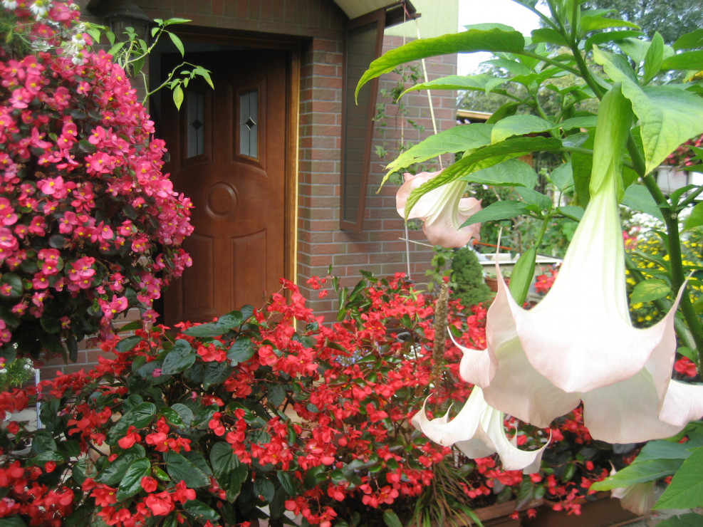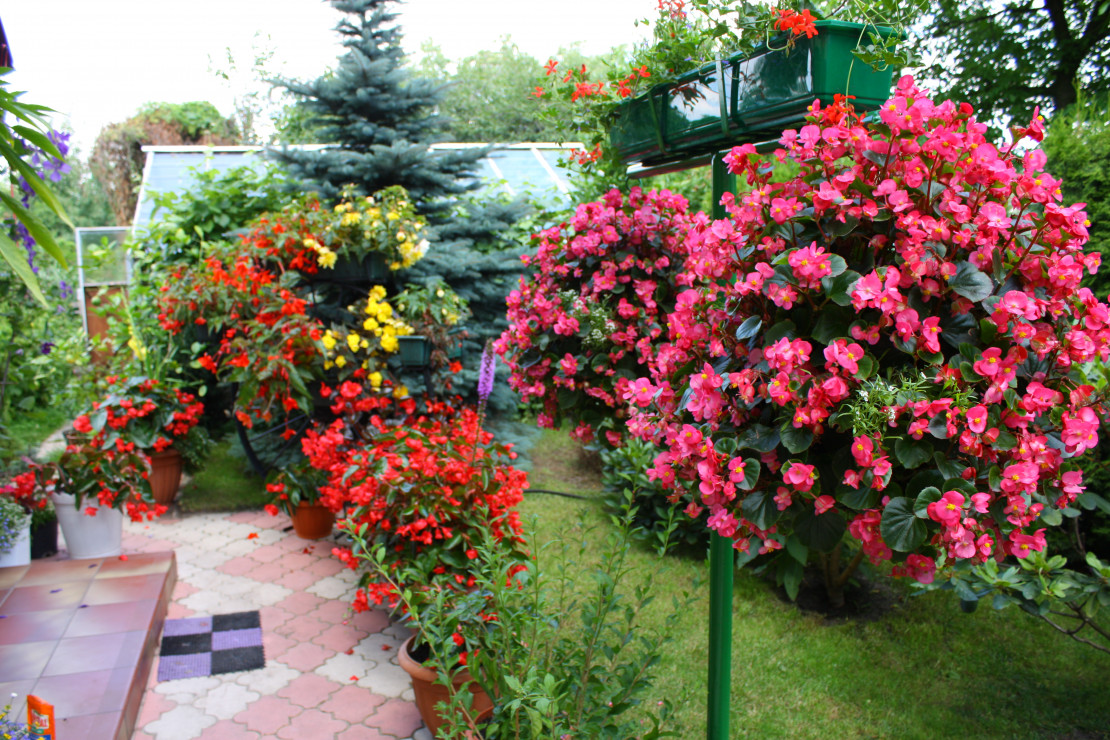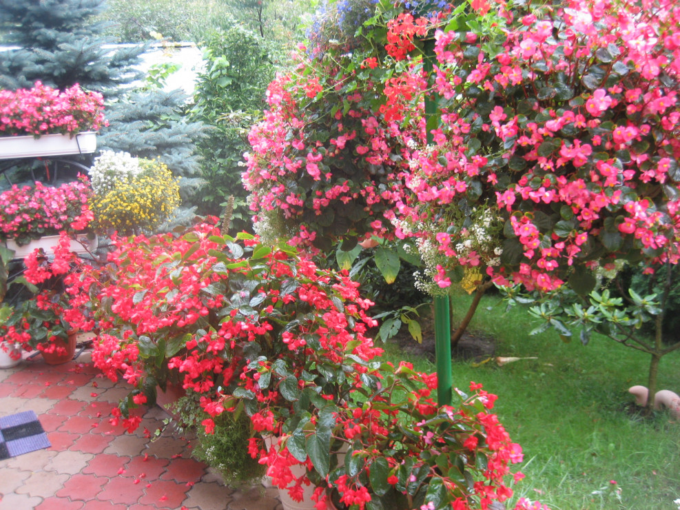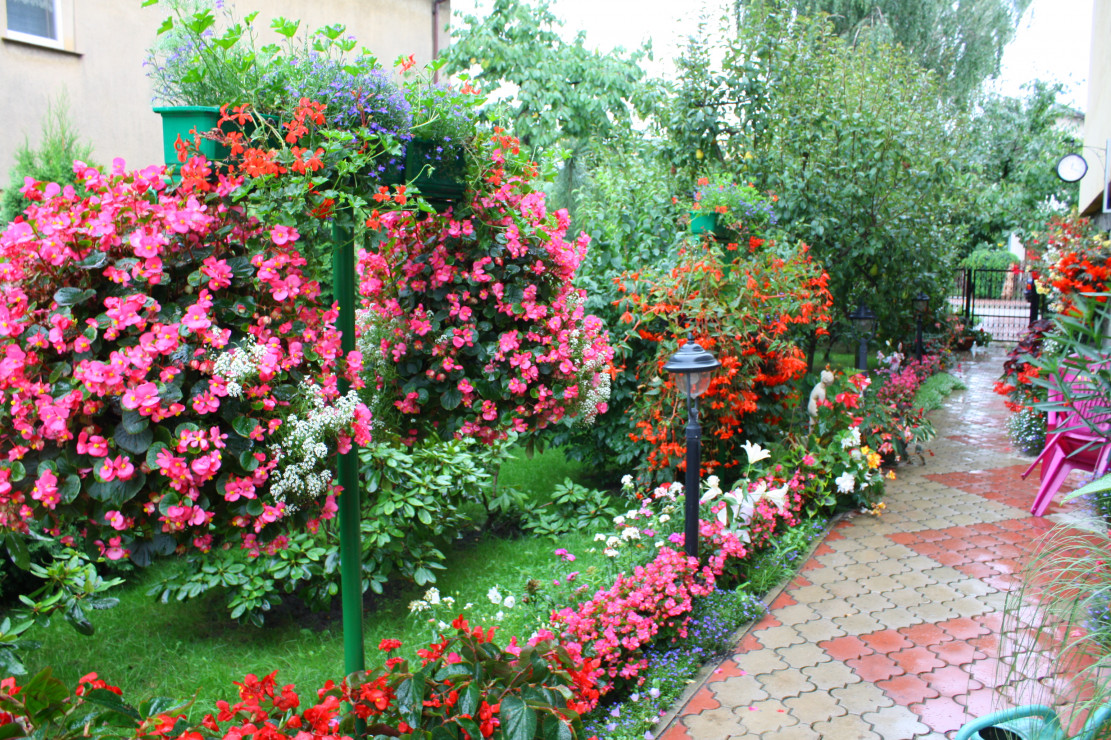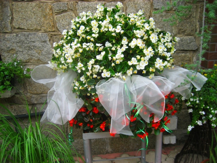 W moim ogrodzie wykorzystałam kosze rożnej wielkości i o różnych kształtach. Teraz opiszę jak obsadzać kosze, tak aby stanowiły ładny element dekoracyjny przez całe lato, aż do późnej jesieni. Można to robić na dwa sposoby: Pierwszy to obsadzanie kosza kwiatami od zewnątrz, a drugi od wewnątrz. Ja preferuje ten drugi. Kosz stawiamy na doniczce lub wiaderku wyścielamy go agrowłókniną. Na dno kładziemy kawałek foli wyciętej w postaci kółka (celem zatrzymywania wody). Następnie na folie sypiemy trochę ziemi i robimy w koło foli 4 naprzeciwległe nacięcia w materiale. Przez wykonane nacięcia przeciągamy sadzonki uprzednio owijając folią (aby się nie połamały). Przysypujemy znowu ziemią zmieszaną z wolno-działającym nawozem w granulkach. Następne nasadzenia będą 15 cm wyżej, ale po ukosie, aby kwiaty się nie stykały swobodnie wypełniając puste miejsca tworząc nasadzenia w postaci literki V. Ile będzie nasadzeń zależy od wielkości kosza i sadzonek. Zanim dokonamy ostatniego nasadzenia kwiatami na górnym brzeg kosza naciągamy gumkę (lub obwiązać sznurkiem) następnie obcinamy materiał tak by jego brzegi wystawały na 10 cm poza krawędź kosza. Wystające brzegi materiału zawijamy do środka obsypując warstwą ziemi. Dokonujemy ostatniego nasadzenia, podlewamy kwiaty i zawieszamy na miejscu przeznaczenia. Jeśli będzie to kosz bardzo duży, taki jak ten którego zrobiłam na cześć Pary Młodej to do środka musimy najpierw włożyć rurkę z PCV nawierconymi otworami.