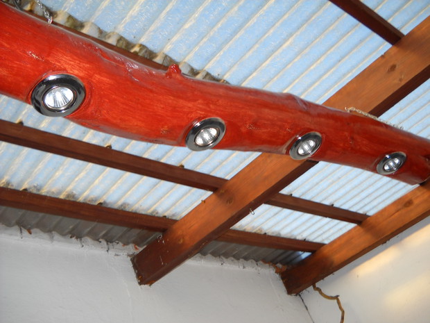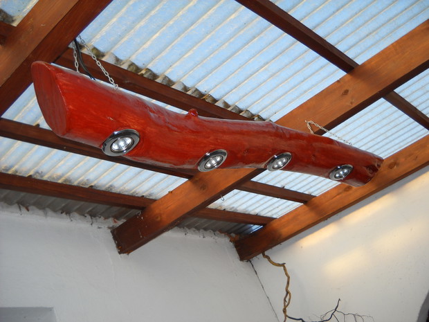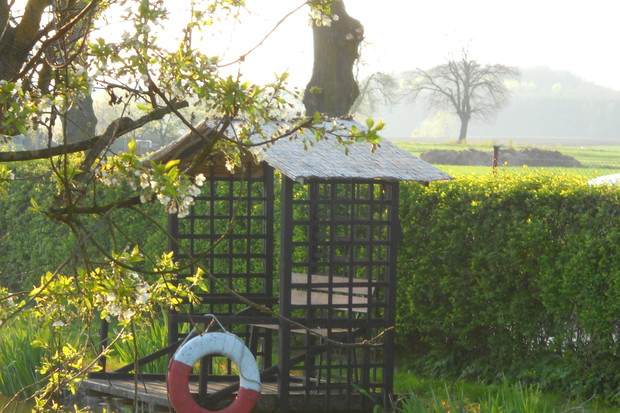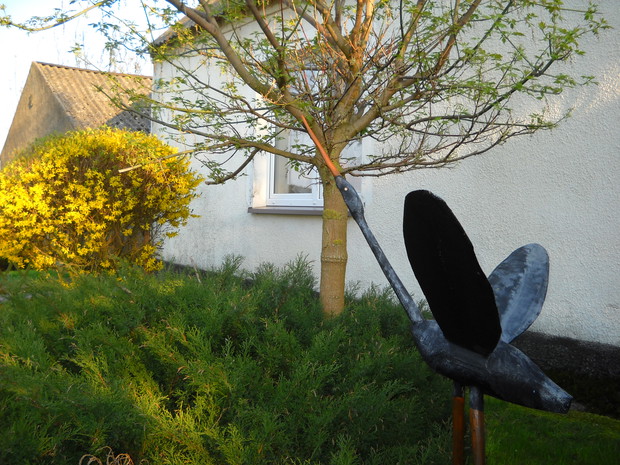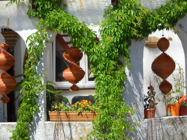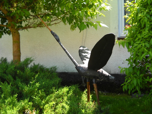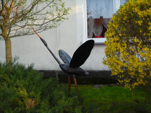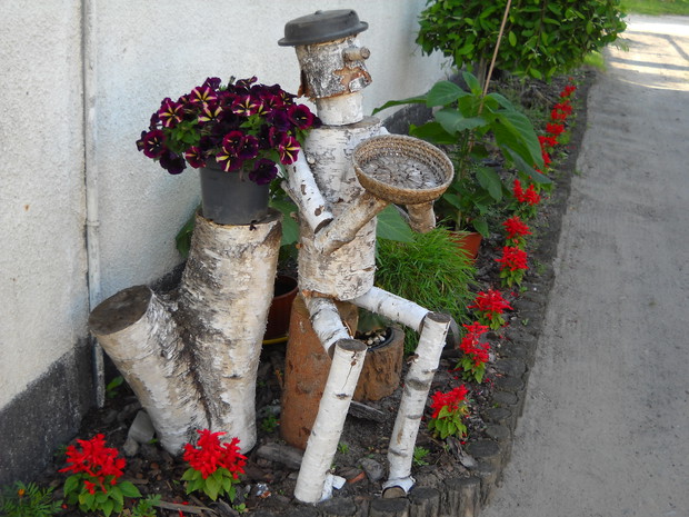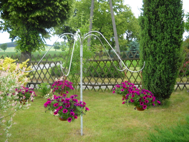 Wszystkie dekoracje w ogrodzie które są pokazane na zdjęciach wykonał własnoręcznie mąż Roman.Głównym materiałem do zrobienia ozdób jest drewno.Altanka wykonana z desek i pokryta trzciną,jest miejscem na odpoczynek dla męża.Lampa to kawałek grubego drewna w którym nawiercone zostały otwory na lampki.Zawisła w altance przed domem gdzie odpoczywamy wspólnie i spędzamy w niej miłe ciepłe wieczory.Wiatraczki ze zwykłych klapek świetnie prezentują się w oknach altanki.Przed domem na drewnianym pinku z brzozy zasiadł 'brzozowy chłopek".Ptaki zostały również zrobione z drewna korpus z grubszego kawałka drewna natomiast skrzydła ze zwykłych desek.Dziób i nogi z grubszych patyków.Kwietnik na surfinie zrobiony został z metalu grubsza rura to podstawa natomiast pięć prętów zostało do niej przyspawane i wygięte.Kwietnik został nazwany przez nas "karuzela".
