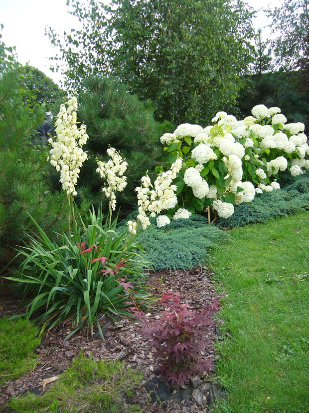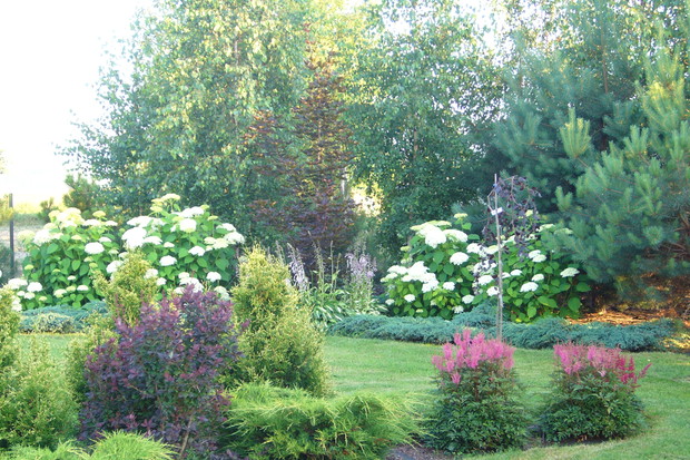 Mój ogród otoczony jest sosną czarną i brzozami , na tle których latem kwitną przepiękne hortensje . Na wiosnę w moim ogrodzie kwitną ubiorki oraz azalie . Wewnątrz ogrodu klomby obok jeszcze malutki ale juz piękny buk pendula. Wszystkim polecam hortensje do swoich ogrodów to piękne i wbrew opiniom mało wymagające kwiaty.