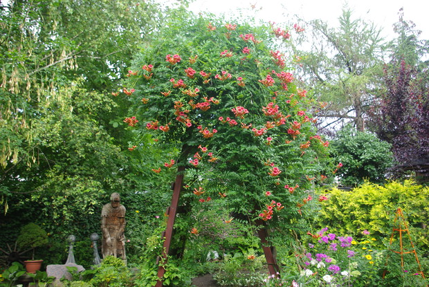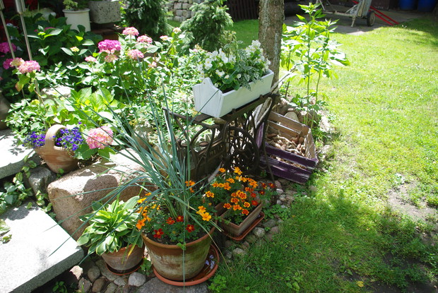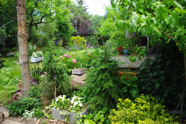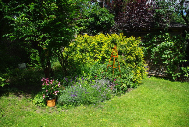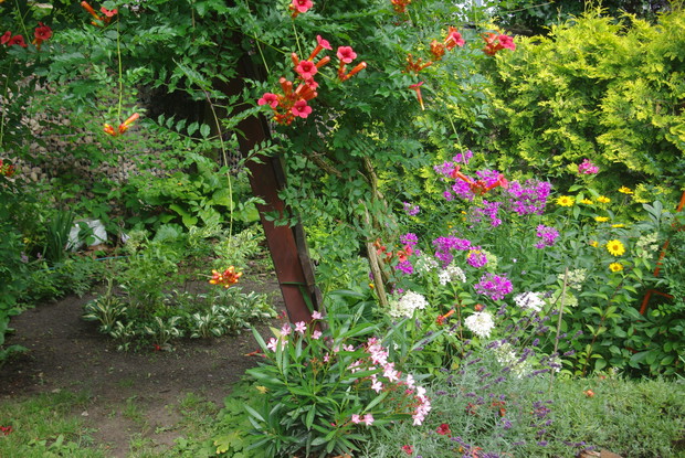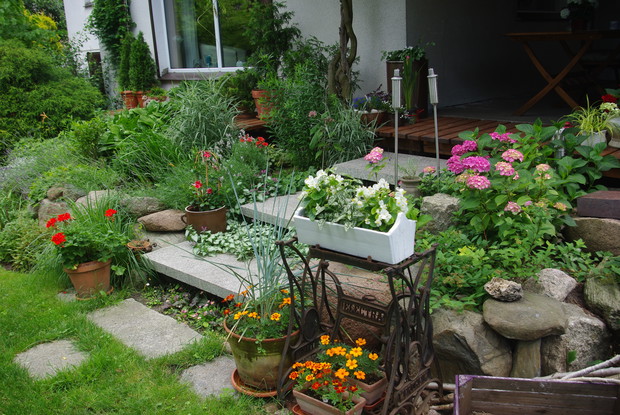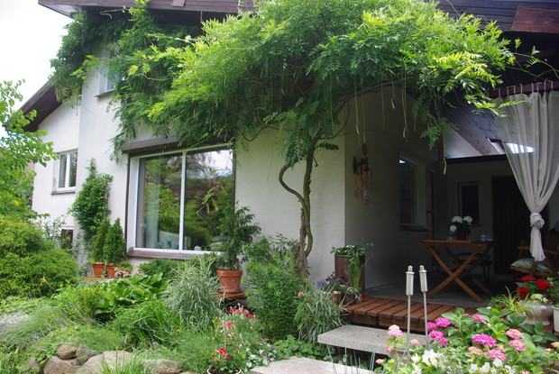 Tak naprawdę ogród miałam zawsze przeciętny.Najpierw był warzywny ,a kwiaty i krzewy zbierałam drogą sąsiedzką.Teraz od kilku lat mogę powiedzieć,że chcę mieć miejsce dla siebie i rodziny zrobione własnoręcznie.Wykorzystuję rady z Waszego czasopisma czkając na kolejny numer, podglądam ogrody znajomych ,odwiedzam centra ogrodnicze.Mój ogród nie ma zwartej całości,lecz przenosi nas w ZAKĄTKI do czytania np.ławeczka z pelargoniami,wąchania rabata z lawendą czy leśną polankę z borówkami gdzie przechodzi się pod pergolą z milinem.Wnętrza ogrodowe tworzyłam etapami często zmieniając koncepcję ,a właściwie rośliny ją zmieniały rosnąc w danym miejscu lub nie.Ucząc się na błędach głównie swoich syn w tym roku powiedział:Mamo ,ale ogród w tym roku masz naprawdę ładny.To przekonało mnie,aby spróbować stanąć w szranki konkursowe. Przedstawiam ZAKĄTKI MAŁGONI.
