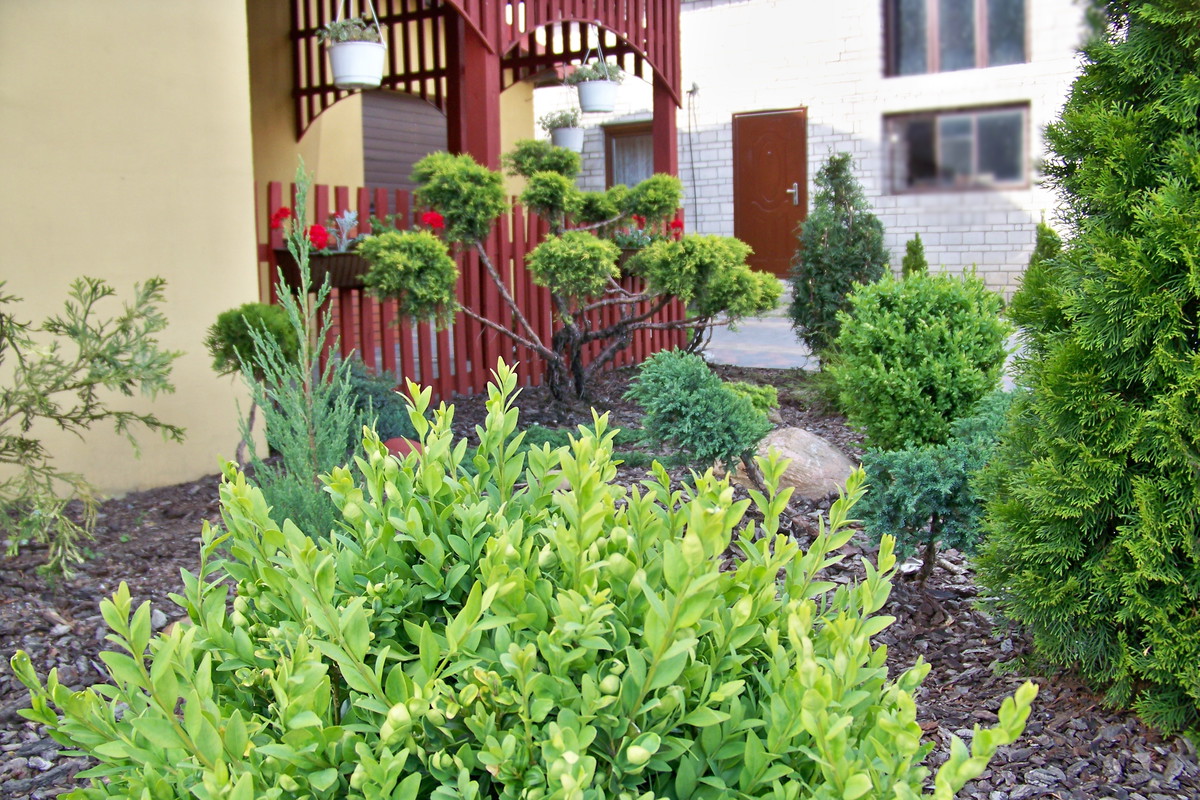 Na zdjęciu widoczny jest klomb z zimo zielonych krzewów iglastych i liściastych.Postanowiłam stworzyć go przed domem, ponieważ takie rośliny są ozdobą przez cały rok.W tle widać jałowca którego uformowałam na drzewko bonsai. W ten sposób uzyskałam przestrzeń i światło słoneczne dla krzewów rosnących w pobliżu. a jałowiec stał się ozdobą całego klombu.