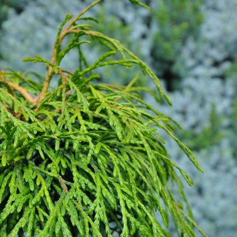 Polska, karłowa odmiana o kopiastym pokroju i wolnym tempie wzrostu, osiąga 0,5-1 m wysokości oraz podobną szerokość. Pędy i gałązki są drobne, ułożone horyzontalnie, przewieszające się, są pokryte płaskimi, zielonymi łuskami oraz grubszymi igłami. Zimą krzewy brunatnieją. Rośliny w pierwszych latach uprawy tworzą formy płaskokuliste, później wykształcają przewodnik i się wypiętrzają. W handlu oferowane są także formy pienne. Odmiana odporna na mróz, strefa 5b.